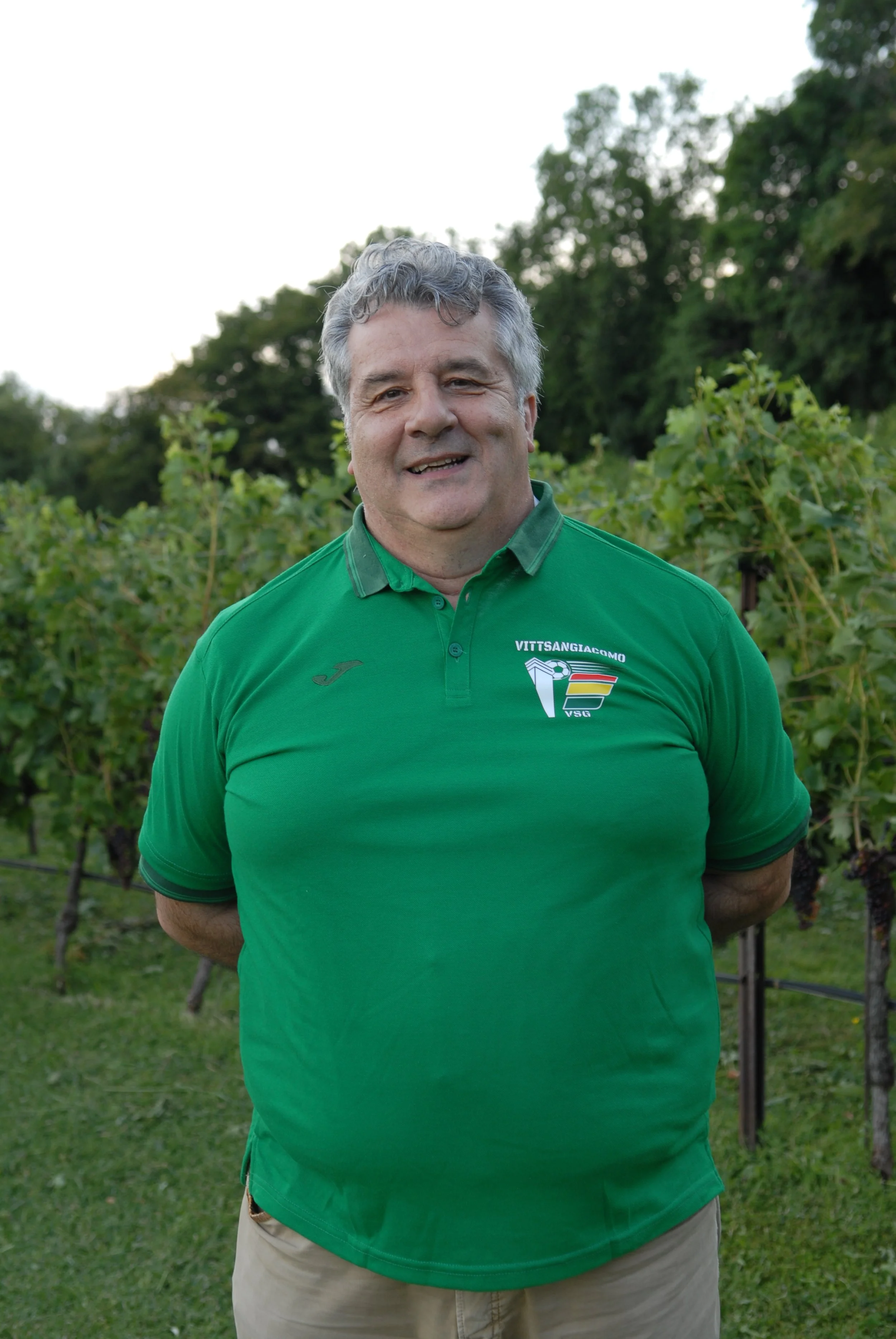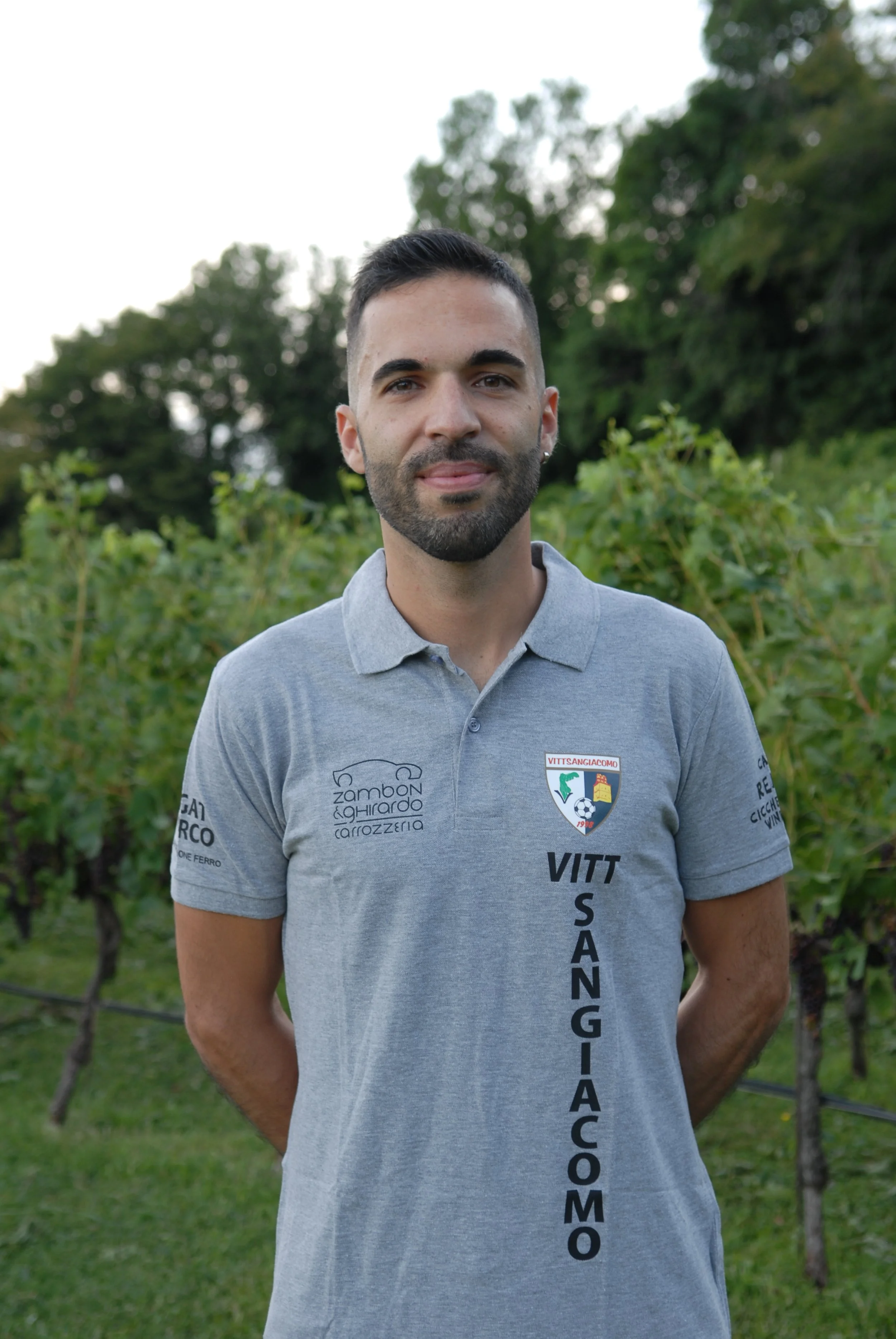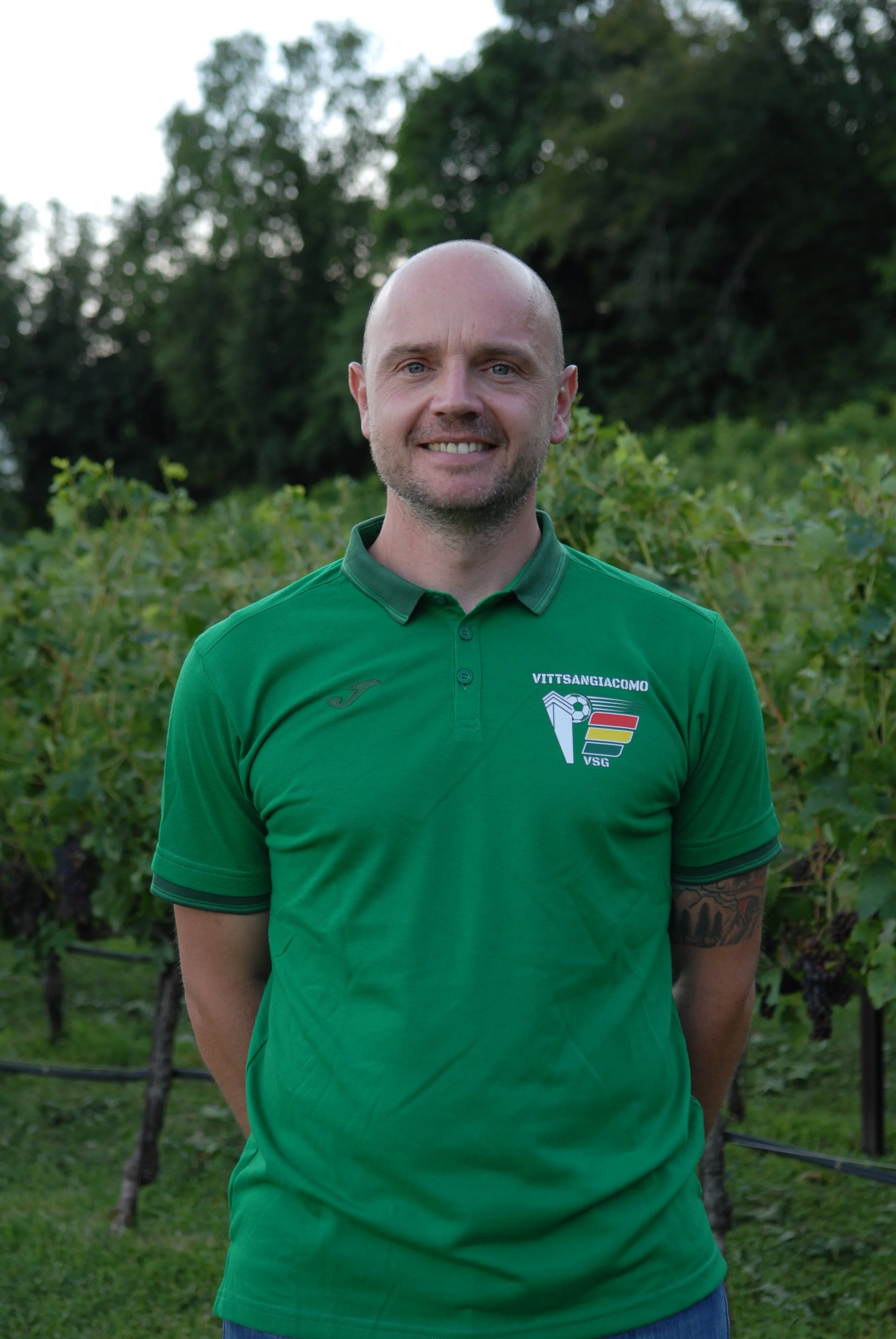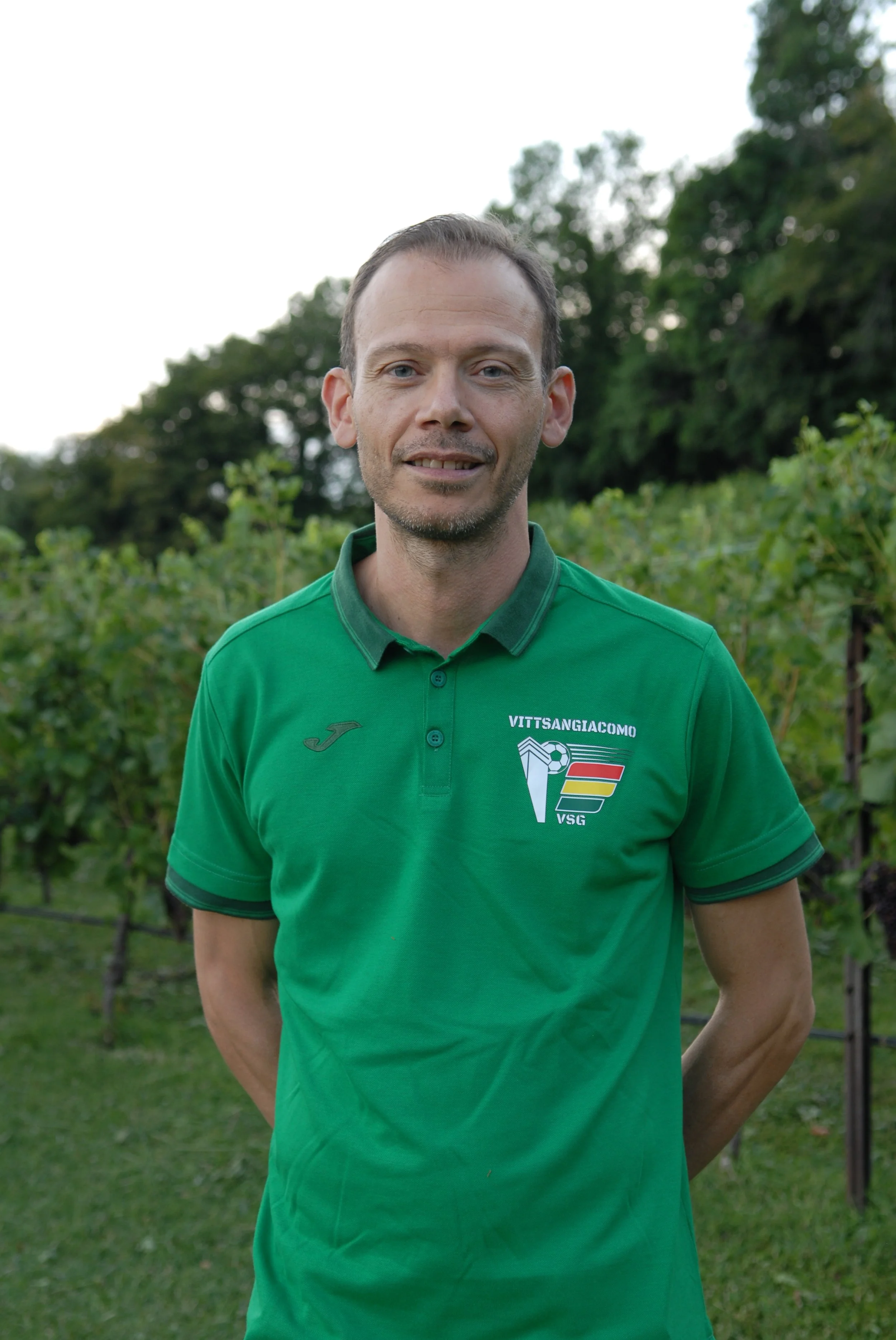• Uomo con capelli castani, barba e occhi chiari indossa una maglietta da calcio con i colori rosso, giallo e verde, in piedi in un'area verde con arbusti e alberi sullo sfondo.